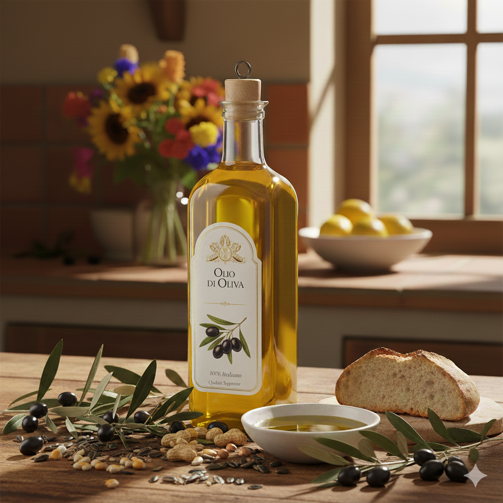 Olio di oliva di qualità superiore, ottenuto dalla miscela di oli di oliva raffinati e oli di oliva vergini.